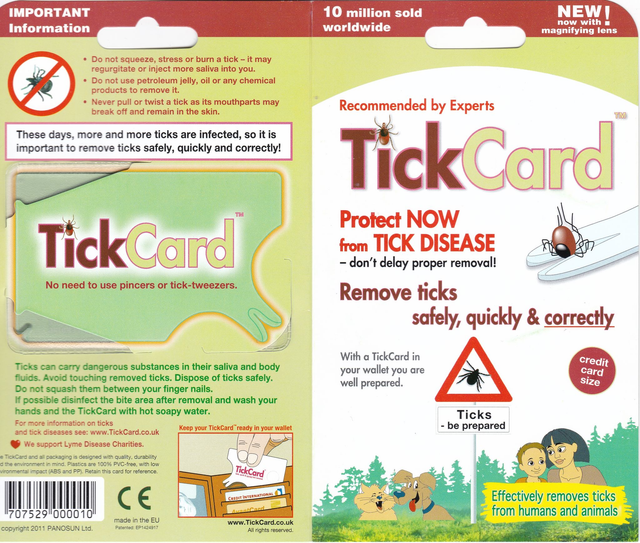 Lyme disease (transmitted via ticks) has become an increasing problem in the UK. Even when precautions are taken, occasionally ticks will attach themselves to you or your pets. This tick remover card has been designed to ensure that the whole tick is removed safely.
